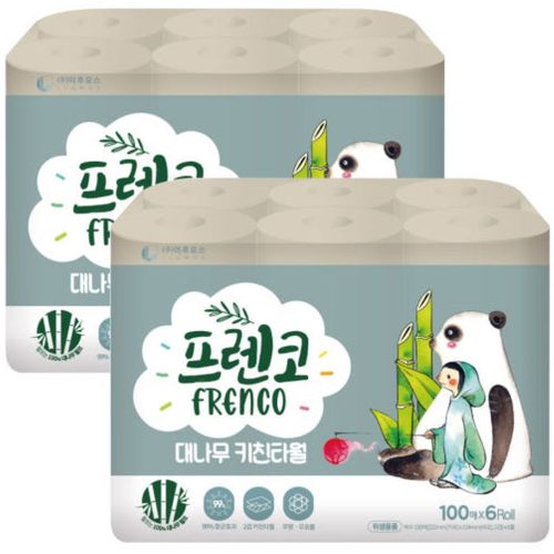 대나무키친타올 2겹X100매X6롤 천연대나무펄프 향균효과 위생키친타월 프렌코밤부 PTP엠보싱