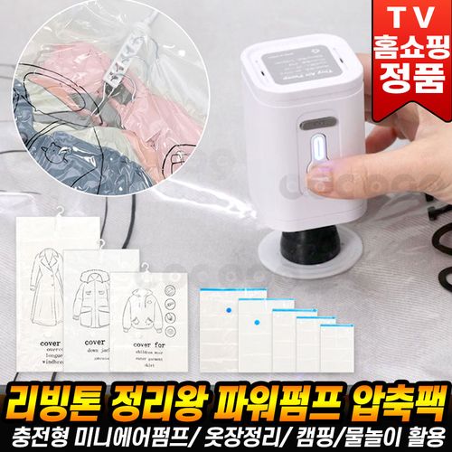 [로코스나인 홈쇼핑] 리빙톤 정리왕 파워펌프 압축팩 풀세트 무선 압축기 에어 파워 펌프 이불 여행 가방 옷 패딩 옷걸이 정리 진공팩 [로코스9]