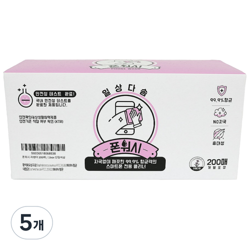 폰워시 스마트폰 전용 클리너 일회용 티슈 라벤더향(200매), 5개, 단일색상