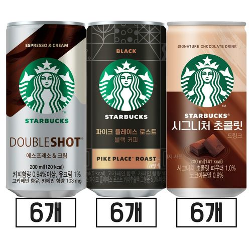스타벅스 커피 음료 3종 6개씩(더블샷에스프레소+파이크플레이스로스트블랙+시그니처초콜릿)