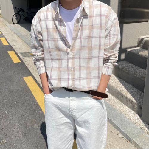 바캉스룩 린넨 체크 남성와이셔츠 빅사이즈 파스텔 긴팔 셔츠 남방 와이셔츠 결혼식하객룩 남자셔츠