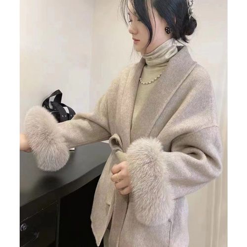 여성스럽고 세련 시크 울 100소매 탈부착 리얼퍼 반코트