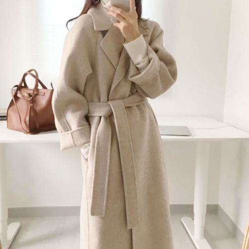 여성 겨울 클래식 카라 허리끈 모직 롱 코트 아우터