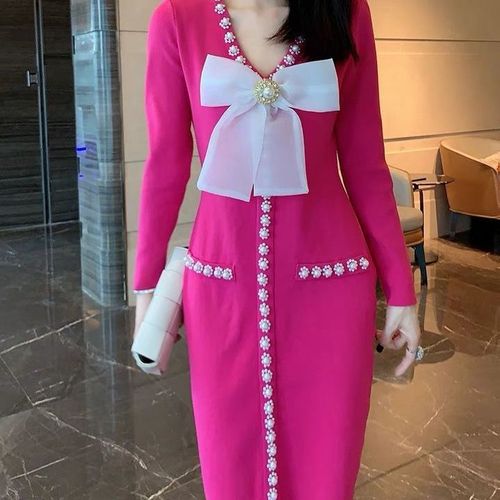 여성용 비즈 브이넥 니트 원피스 리본 원피스 뉴타임즈 G440L652