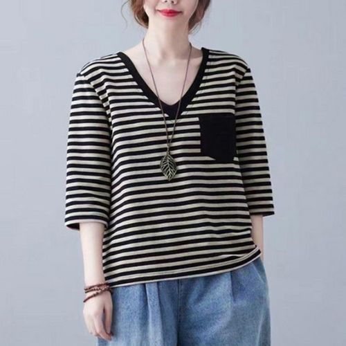 150kg까지 2p 편한 스트라이프 반팔티셔츠 봄여름 여성용 7부소매 브이넥 루즈핏 심플 티셔츠 상의 빅사이즈