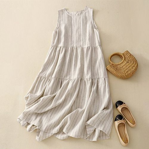 Asure 여자 민소매 린넨원피스 루즈핏 스트라이프 롱원피스 라운드넥 나시원피스