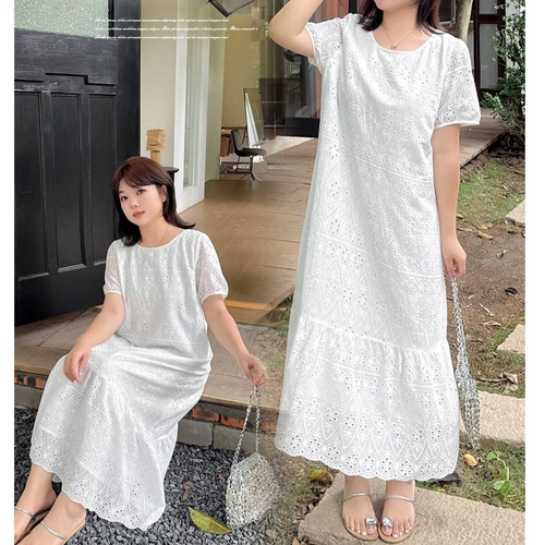 마샹스 [빅사이즈/120kg가능] 펀칭 레이스 바캉스 롱 원피스 여름 루즈핏 반팔 데일리룩