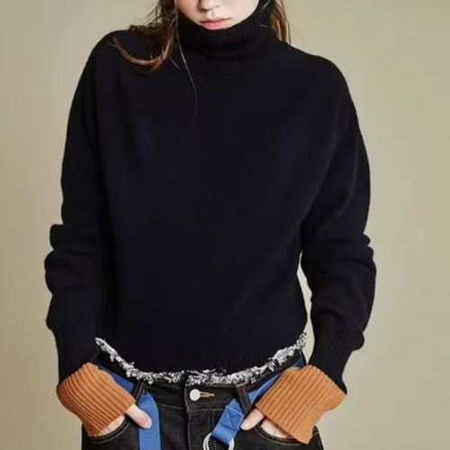 오빵 여성용 터틀넥 목폴라 겨울 루즈핏 소매배색 니트티 루즈핏 스웨터 폴라니트
