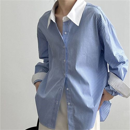 삼제태전 봄가을 여성용 스트라이프 긴팔 셔츠 루즈핏 캐주얼 블라우스 기본 데일리 룩