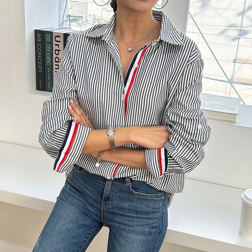 마이쏭 배색라인스트라이프셔츠 여성 스트라이프 셔츠 카라 셔츠 배색라인 세련된룩 봄 가을 신상