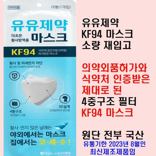 재입고 최신제조 유통기한2023년8월 유유제약KF94마스크 안전한4중구조MB필터 100매