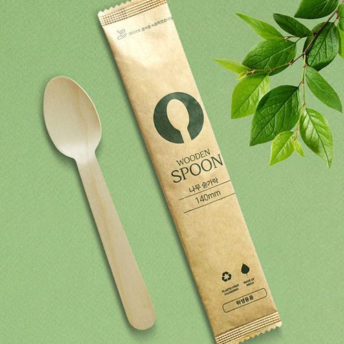 친환경 일회용 나무 스푼 140mm 개별포장, 1세트, 100개입