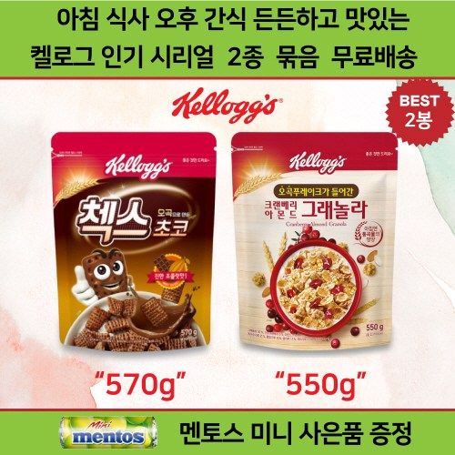 켈로그 시리얼 2종 모음 골라담기 혼합 세트 총 2개 켈로그 첵스 초코 570g + 크렌베리 아몬드 그래놀라 550g 아침식사 간식대용 오후 4시까지 주문 당일 발송 무료배송