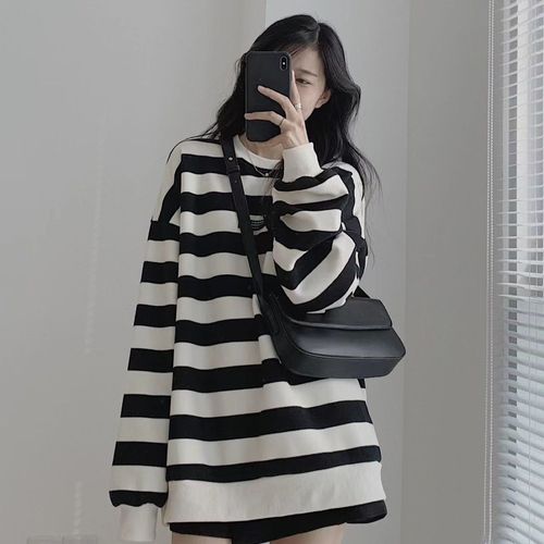 국조 스트라이프 맨투맨 여 봄 당색 일본계 빈티지 오버사이즈 박시 긴팔 상의