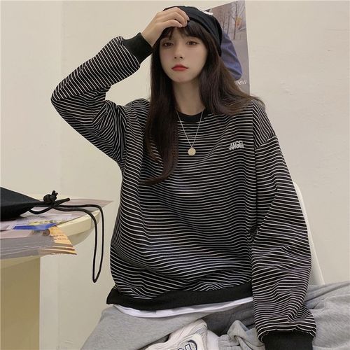 페이크 투피스 라운드 풀오버 긴팔 스트라이프 맨투맨 여 봄가을 얇은 한국 루즈핏 나른한 상의