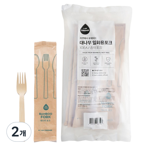 아이엠그리너 친환경 일회용 생분해 대나무 포크 개별 종이포장, 2개, 10개입