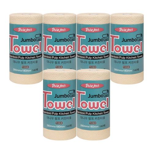 개별포장 3겹 280x180 점보사이즈 뱀부 키친타올 140매 x5롤+1롤 100% 대나무펄프, 6개, 140매