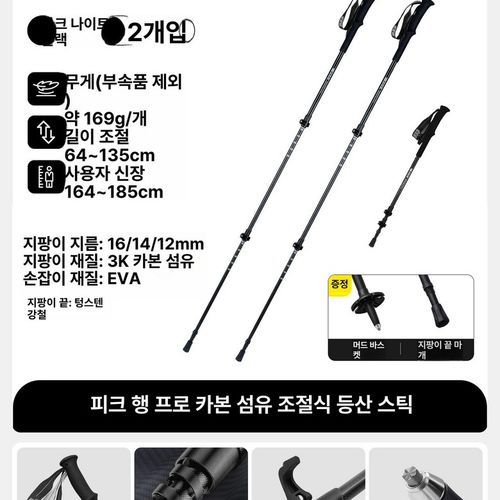 3K 탄소섬유 로드 3단 175g 62-135㎝ 전문 등산스틱 (2개)