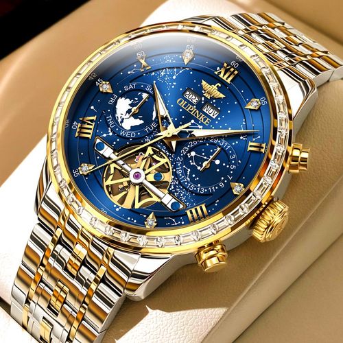 OUPINKE 남성 시계 정품 자동 기계식 오토매틱 럭셔리 명품 워터프루프 야광 메탈 큐빅 다기능 별이 손목