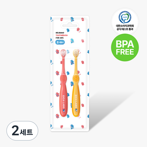 BPA FREE 에이카랩스 어린이 유아 코뿔소 칫솔 2종 만2세 이상 초등학교 저학년 유치원 어린이집, B타입(노랑+분홍), 2세트, 2개입