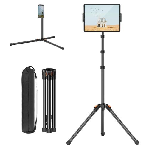180cm 높이조절 접이식 태블릿 삼각대 + 360도 회전 클램프, 13인치 아이패드 갤럭시탭 호환, 파우치 포함 장대형 스탠드