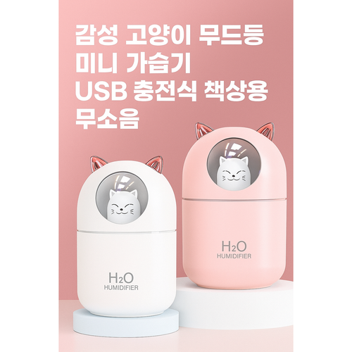 고양이 무드등 미니 가습기 USB 충전식 초음파 저소음 차량용, 화이트