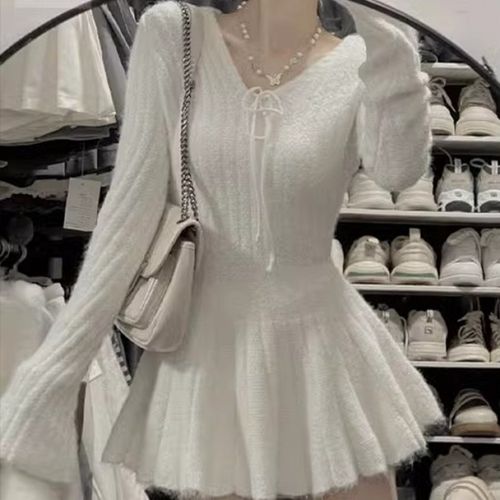 해피유통 여성용 화이트 브이넥 니트 a라인 원피스 이너 스커트 BJJ001