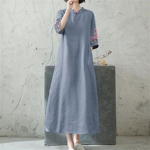 TKX 편안한 중년여성 봄여름 복고풍 패션 스타일 원피스 자수 장식 면마 소재 칠부소매 롱 엄마옷 K78