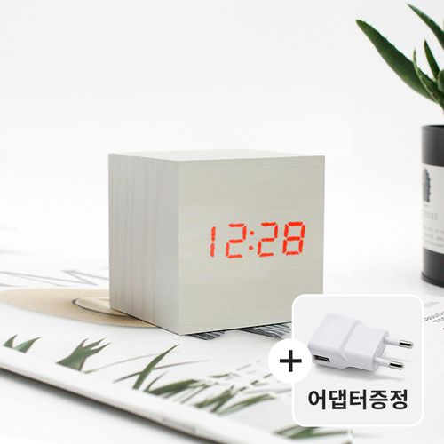 디지털 LED 탁상시계 전원어댑터 포함 우드 미니 큐브, 화이트우드+레드LED