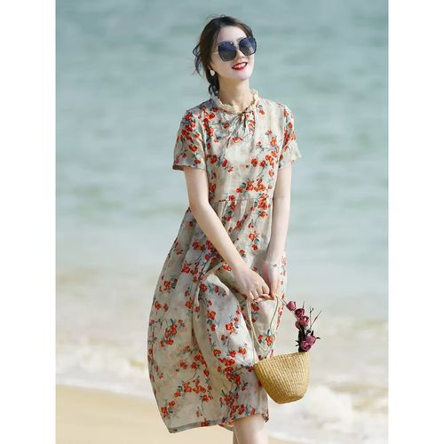 COSYEVNO 여성 여름 면마 원피스 빈티지 프랑스풍 고급스러운 프린트 플라워 롱 스커트
