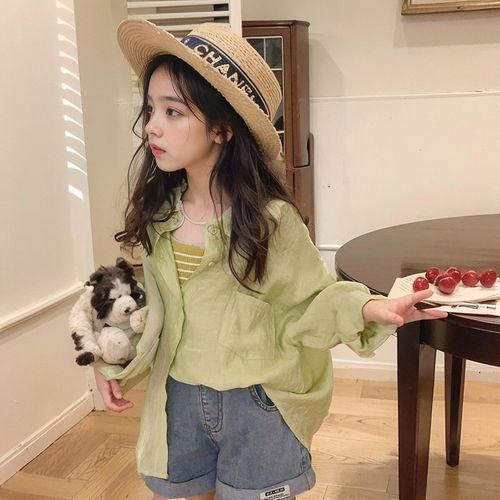 DA4044여아 키즈 주니어 여름 고퀄 린넨 마 실크 코튼 면혼방 카라넥 긴팔 베이직 루즈핏 자외선차단 프렌치 셔츠 남방 티셔츠 얇고 시원한 캐주얼 데일리 아동복