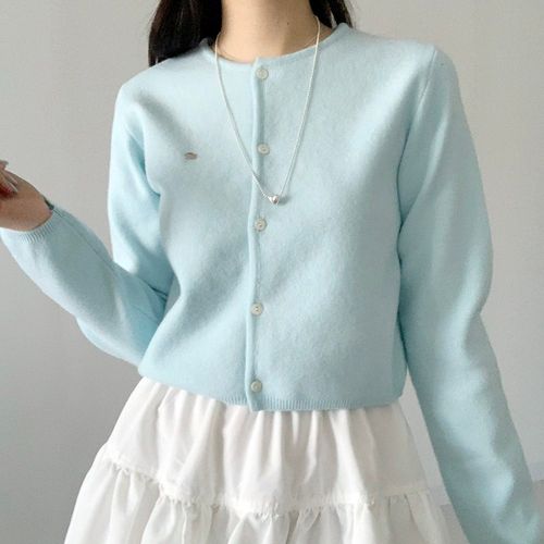[여리핏] 데이지클로젯 폴앤 뱃지 파스텔 라운드넥 긴팔 니트 가디건 / 봄 가을 간절기 긴소매 숏 일자핏 여성 여자 아우터 무지 심플 베이직 데일리룩 기본템 청순 러블리 나들이룩