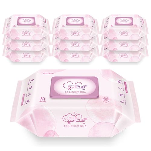 (프리미엄 75gsm) 꿈에그린 초순수 프리미엄 물티슈 도톰하고 넉넉한 사이즈 엠보싱 아기물티슈 캡형, 80개입, 10개