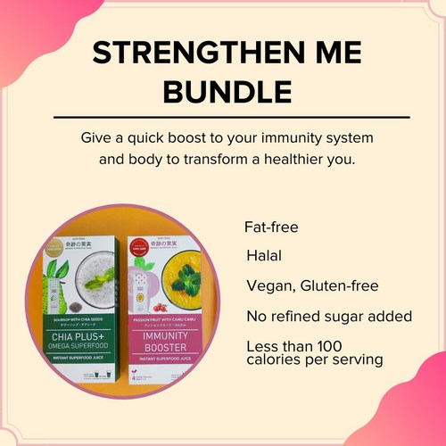 Strengthen Me Superfood Juice Bundle-Immunity and Anti-inflammatory-Passionfruit Camu Camu + Soursop은 면역력 강화와 항염 효과가 뛰어난 슈퍼푸드 주스 세트입니다. 파션프루트와 카무 카무, 소르소프의 강력한 조합으로 활력을 주며 건강을 챙길 수 있는 최적의 선택입니다. 자연적인 성분으로 신체 면역 시스템을 지원하고 염증 완화에 도움을 주어 건강한 라이프스타일을 추구하는 분들께 추천합니다.