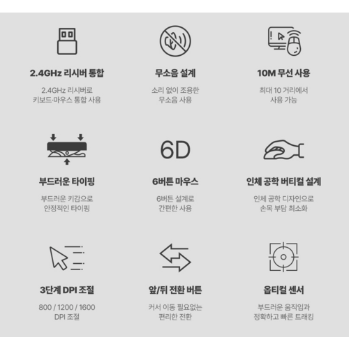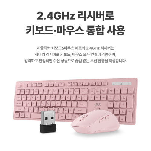 처음에 세트가 저렴해서 구매했는데 생각보다 디자인이 깔끔해서 책상 위가 정돈된 느낌이었어요. USB 리시버 하나로 키보드랑 마우스 둘 다 연결되니 편하고, 설치도 어렵지 않았습니다. 키보드는 키스킨 없이 쓰면 소음이 조금 있는 편인데, 키스킨 착용하면 조용해져서 조용한 사무실에서도 부담 없네요. 마우스 클릭은 정말 소리가 거의 없어서 좋습니다.