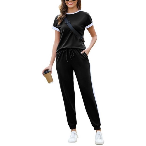 Marvmys 여성용 반소매 트랙수트 세트 투피스 스웨트 의상 컬러 블록 조깅 수트 포켓 포함 블랙.127118