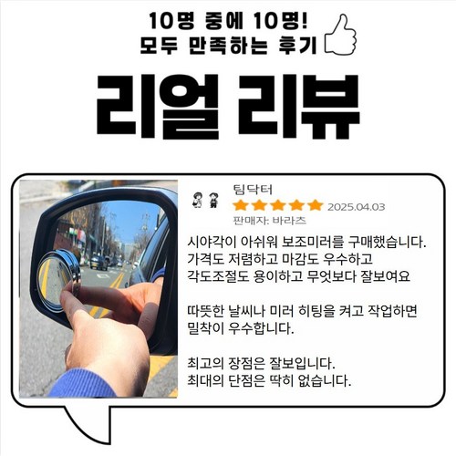 후진할 때나 좁은 골목에서 운전할 때마다 사각지대가 신경 쓰였는데, 이 보조거울을 달고 부터는 훨씬 편해졌어요. 초보자라도 쉽게 설치할 수 있고, 거울 품질도 선명해서 왜곡 없이 잘 보여서 만족스럽습니다. 야간에도 큰 무리 없이 쓸 수 있어 실제 운전할 때 자신감이 좀 생겼어요.