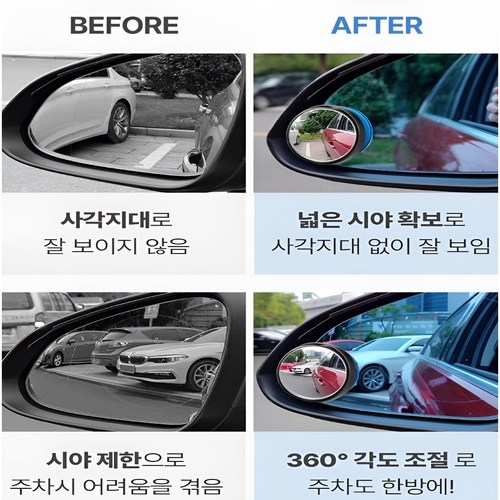 처음엔 이런 작은 보조미러가 큰 도움 될까 싶었는데, 막상 써보니 사각지대가 훨씬 잘 보여서 운전할 때 훨씬 안심돼요. 설치도 간단해서 혼자서도 쉽게 붙일 수 있었고, 각도 조절도 자유로워서 딱 원하는 위치로 맞추기 편리했어요. 주차할 때나 좁은 골목길 주행 시에도 사각지대 걱정이 줄어 운전 스트레스가 꽤 완화됐습니다.