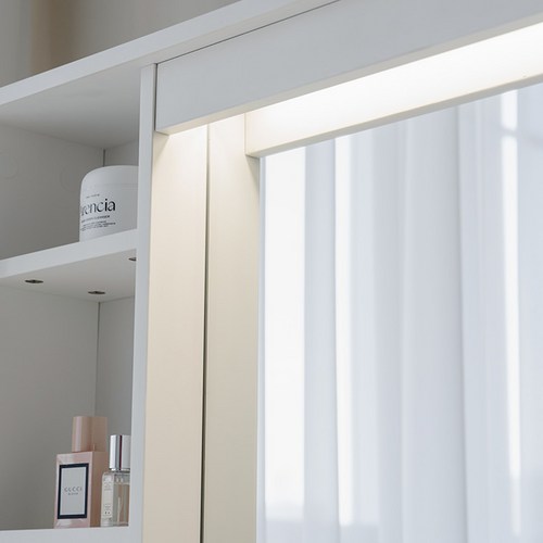 제품 사진과 달리 완전 하얀색은 아니고 약간 크림빛 섞인 색이라 처음엔 당황했어요. 그런데 집 분위기에는 오히려 더 잘 어울려서 만족 중입니다. 배송 시 제품 상태도 좋았고, 다리도 튼튼해 안정감이 있었습니다. LED 조명도 정상 작동하고, 부드럽게 여닫히는 서랍 덕분에 매일 사용하기 편안했습니다.
