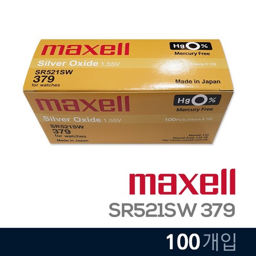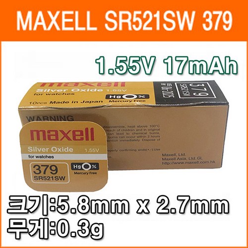 MAXELL 맥셀 SR521SW (379) 10개입 시계 배터리는 신뢰할 수 있는 성능과 오랜 수명을 자랑하는 시계 배터리입니다. 10개입 패키지로 경제적이면서, 다양한 시계 모델에 호환되어 편리하게 사용할 수 있습니다. 고온 및 저온에서도 안정된 전압을 유지해 시계의 정확성을 높이고, 소형 디자인으로 쉽게 교체할 수 있습니다. 실생활에서 매일 사용하는 시계에 최적화된 이 배터리를 통해 언제든지 정확한 시간 관리를 경험해보세요. 고품질의 MAXELL 배터리로 당신의 소중한 시간을 지키세요.