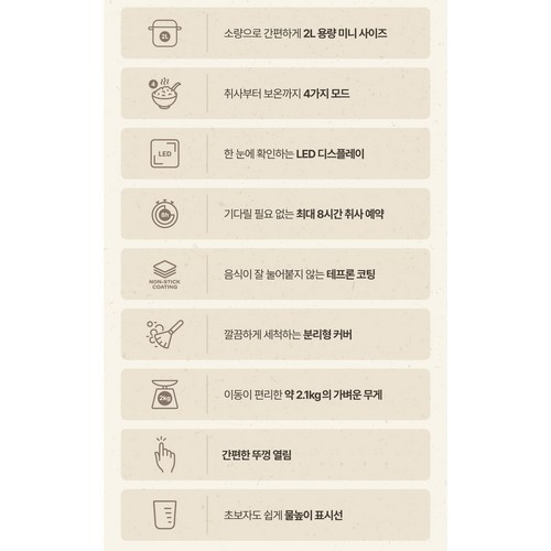 밥솥에 복잡한 기능을 원치 않는 저 같은 사람에게 딱 맞는 제품이에요. 단순한 조작으로 백미 취사가 가능해 초보자도 쉽게 쓸 수 있고, 예약 기능 덕분에 라이프스타일에 맞게 활용할 수 있었어요. 밥맛도 평균 이상이라 요즘 매일 잘 사용 중입니다.