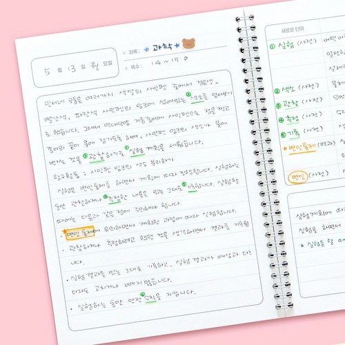 처음엔 노트가 비싸 보여서 망설였는데, 막상 써보니 필기하는 습관을 키우는 데 상당히 유익했어요. 인강 듣는 동안 중요한 부분을 손으로 적으며 집중하는 모습이 보기 좋더라고요. 스프링 제본이라 펴기도 편하고, 단어 정리란이 따로 있어서 효과적입니다.