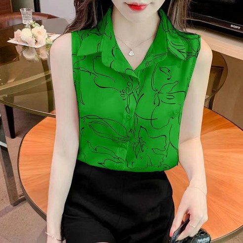 자칠 프린트 셔츠 디자인감이 소중해 배를 가리고 날씬해 보이는 기질 시폰 민소매