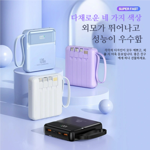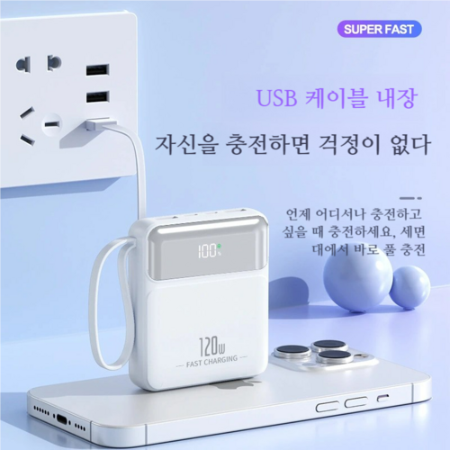 출장을 자주 다녀서 보조배터리를 찾다가 이 제품을 알게 됐어요. 케이블이 내장되어 있어서 따로 챙길 필요가 없다는 점이 가장 편리하더라고요. 20000mAh 용량 덕분에 하루 종일 여러 기기를 충전해도 넉넉했고, 120W 급속 충전 속도도 실제로 만족스러웠습니다. 디지털 잔량 표시가 있어서 배터리 상태도 쉽게 확인할 수 있어 좋았어요. 무게도 적당해서 부담 없이 휴대하고 있습니다.