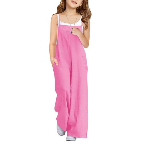 Haloumoning 여아용 와이드 레그 점프수트 아동용 캐주얼 민소매 롬퍼 스파게티 스트랩 오버롤 포켓 및 사이드 슬릿 포함 로즈 레드115059