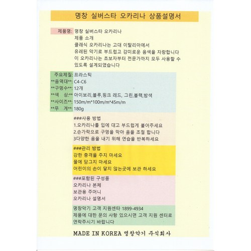 또한, 명창 실버스타오카리나는 내구성이 뛰어나고 조작이 간편해 초보자도 손쉽게 다룰 수 있어, 연습용으로 이상적입니다. 누구나 음악을 즐길 수 있는 기회를 제공하며, 가족이나 친구와 함께 하는 특별한 시간을 만들어 줍니다.