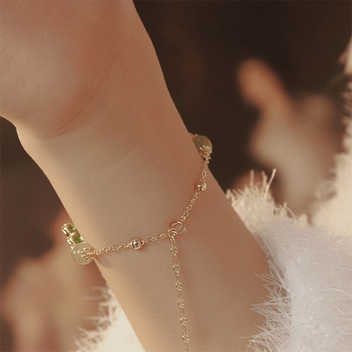 허티안 옥의 자연스러운 아름다움이 돋보이며, 조절 가능한 끈으로 개인의 손목 사이즈에 맞춰 편리하게 착용할 수 있습니다. 또한 부드러운 소재로 제작되어 피부 자극이 없어 일상적으로 착용하기에도 적합합니다.