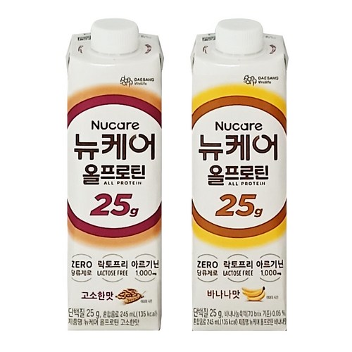 뉴케어 올프로틴 245ml 고소한맛 12 + 바나나맛 12 총24개는 건강한 다이어트를 원하는 분들에게 적합한 영양식품입니다. 두 가지 맛으로 구성되어 지루하지 않게 즐길 수 있으며, 고소한맛과 바나나맛의 조화를 통해 다양한 미각을 만족시킵니다.