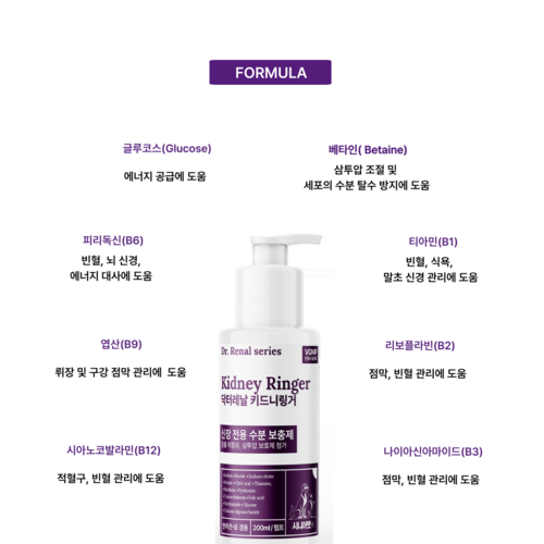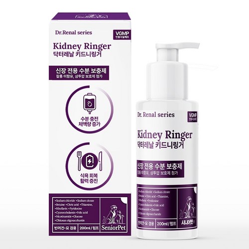시니어펫 키드니링거 반려동물 6종 복합비타민B 칼륨 없는 마시는 수액 200ml는 노령 반려동물의 신장 건강을 위해 최적화된 제품입니다. 이 수액은 전해질이 포함되어 있어 물과 함께 섭취 시 체내 흡수율을 높이며, 탈수 방지에 도움을 주는 베타인 성분을 내포하고 있습니다. 특히 6종의 복합 비타민B가 포함되어 있어 빈혈 관리와 에너지 대사에 긍정적인 영향을 미칩니다. 반려동물의 음수량이 부족할 경우 심각한 건강 문제를 초래할 수 있는 만큼, 키드니링거는 신부전, 요로결석, 방광염 등 다양한 건강 문제 예방에 큰 도움이 됩니다. 사용 방법 또한 간편하여 물 40ml에 1회 펌프로 희석해 주면 돼 반려인들이 쉽게 급여할 수 있습니다. 신장 기능이 저하된 반려동물에게 특히 추천할 수 있는 본 제품은 칼륨이 포함되지 않아 안전성 또한 높습니다. 많은 사용자들이 만족을 표하며 재구매 의사를 보이는 제품이므로, 사랑하는 반려동물의 건강을 위해 키드니링거를 선택해 보세요.