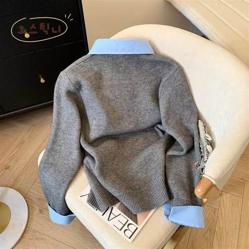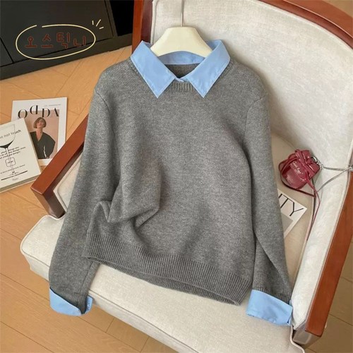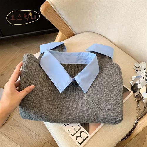 오스틱니 2025 여성용 가을 겨울용 루즈핏 셔츠카라 레이어드 니트 스웨터